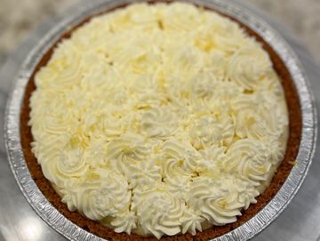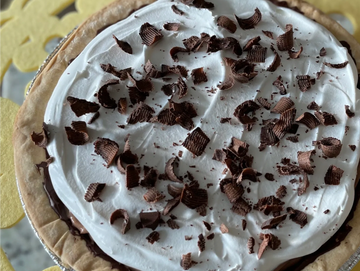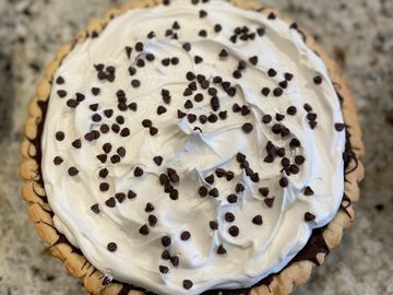 Chocolate covered cookie crust filled with homemade cinnamon vanilla pastry cream lined with fresh bananas and topped with whipped cream and mini chocolate chips
