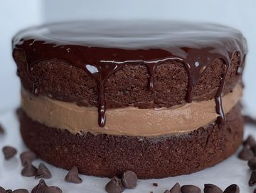 Two fluffy moist layers of chocolate cake filled with fresh homemade chocolate pastry cream with a chocolate ganache drip