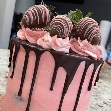 Chocolate cake with fresh strawberry filling, pretty in pink buttercream frosting with a chocolate ganache drip and chocolate covered strawberries on top