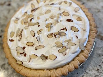 Butter cookie crust filled with homemade cinnamon vanilla pastry cream lined with fresh bananas and topped with whipped cream and sliced almonds