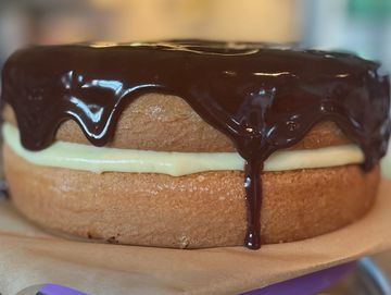 Two fluffy moist layers of yellow cake filled with fresh homemade cinnamon vanilla pastry cream with a chocolate ganache drip