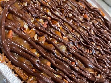 Base of Gramma Edna's cheesecake topped with chocolate and homemade caramel drizzle and pecans