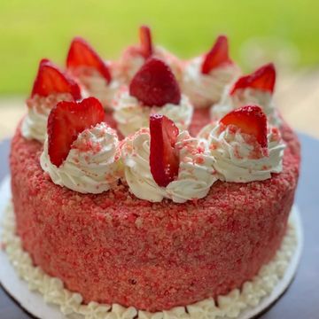 Strawberry Cake with no-bake cheesecake filling, covering is strawberry crumble - Just like the Good Humor Ice Cream Bar